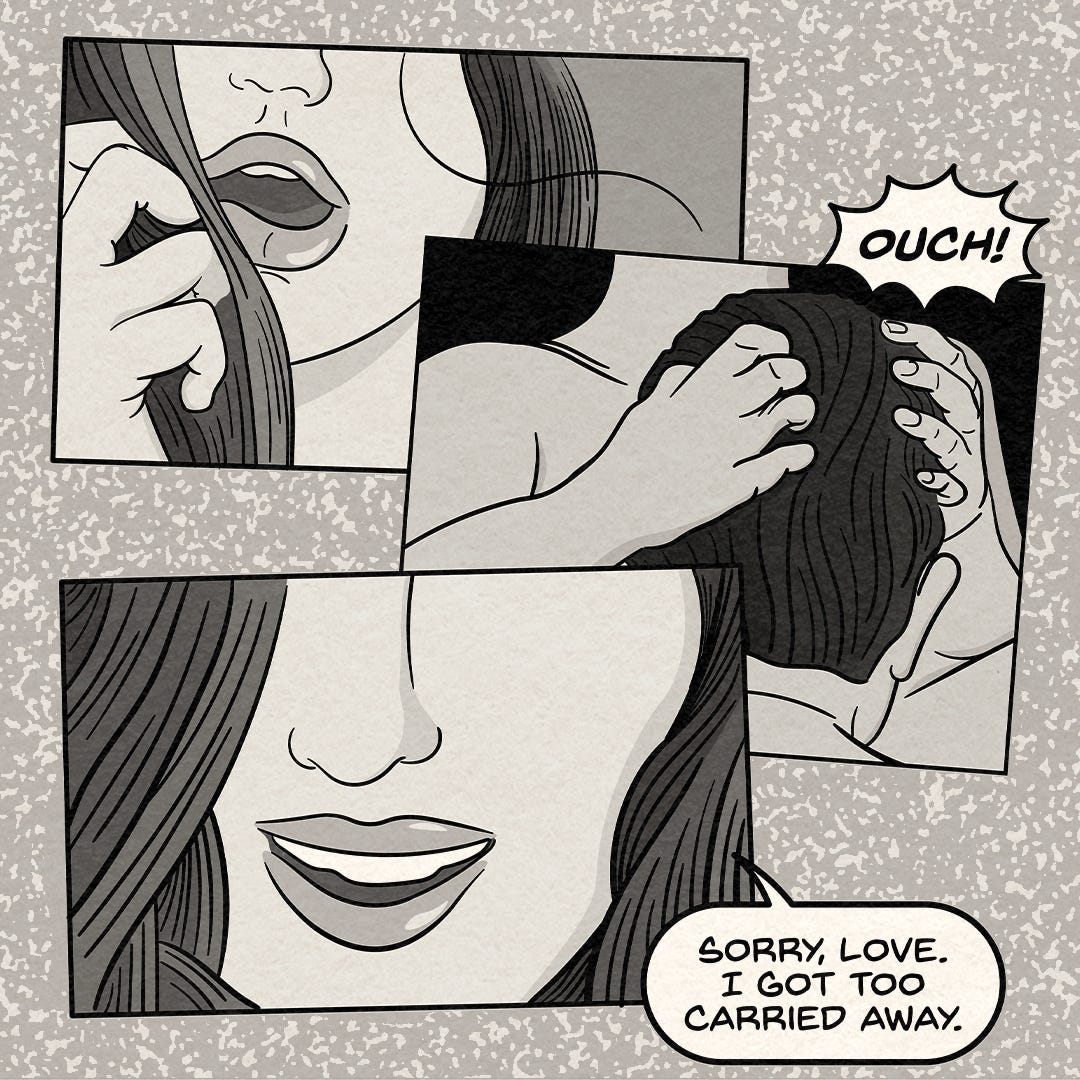 And then the “ouch” panel. Three frames: the pull, the moment, and Monica smiling after. That set of frames was my favorite to come up with. That smile is everything —it’s the story’s thesis in a single expression.