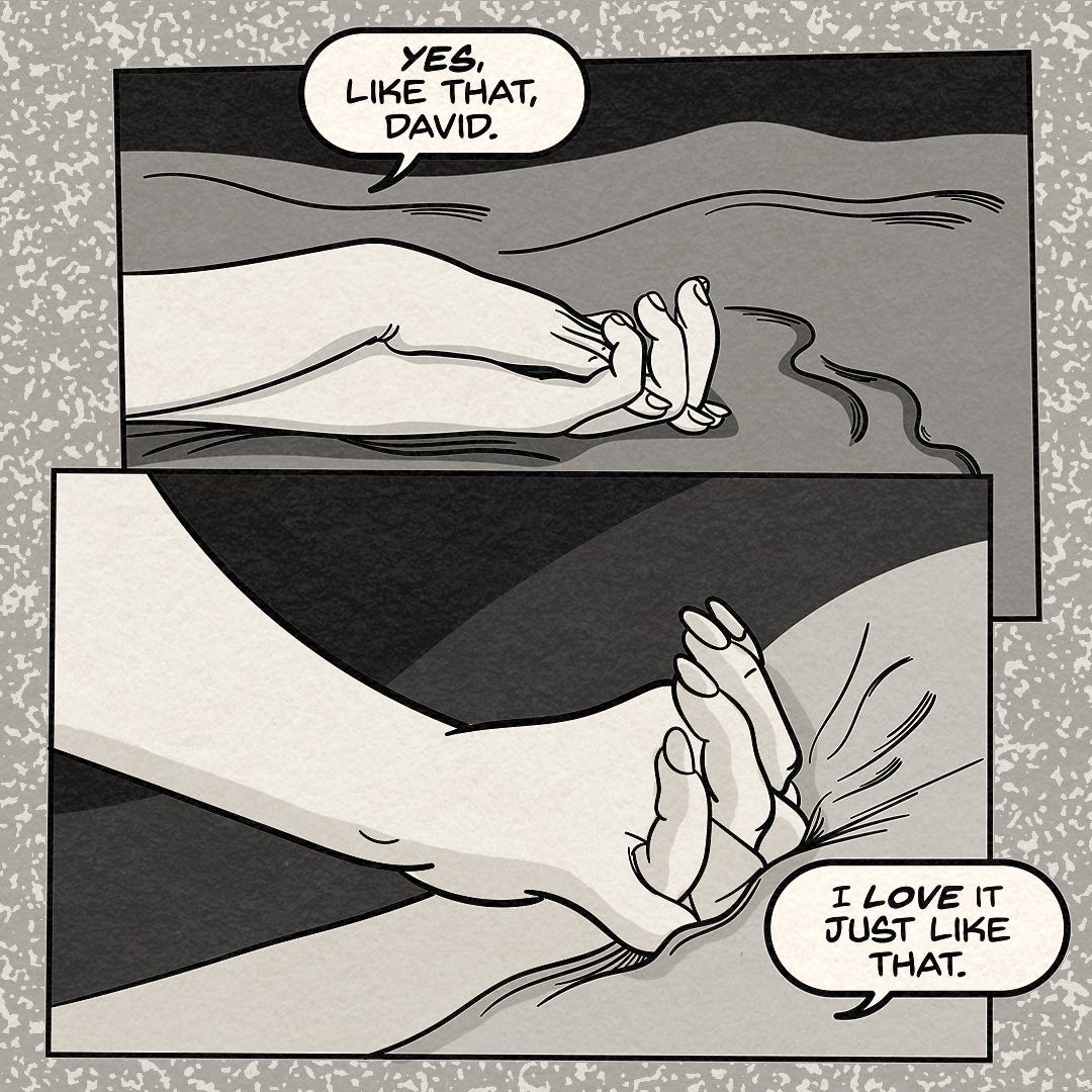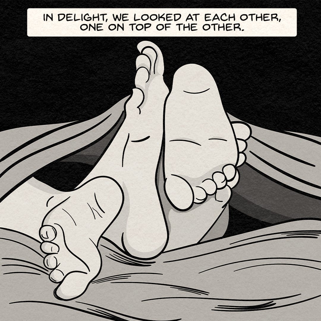 The opening panel doesn’t begin with faces. It begins with feet, tangled and unhurried under sheets. Something small and specific rather than something obvious. An entry point that’s intimate without being declarative.