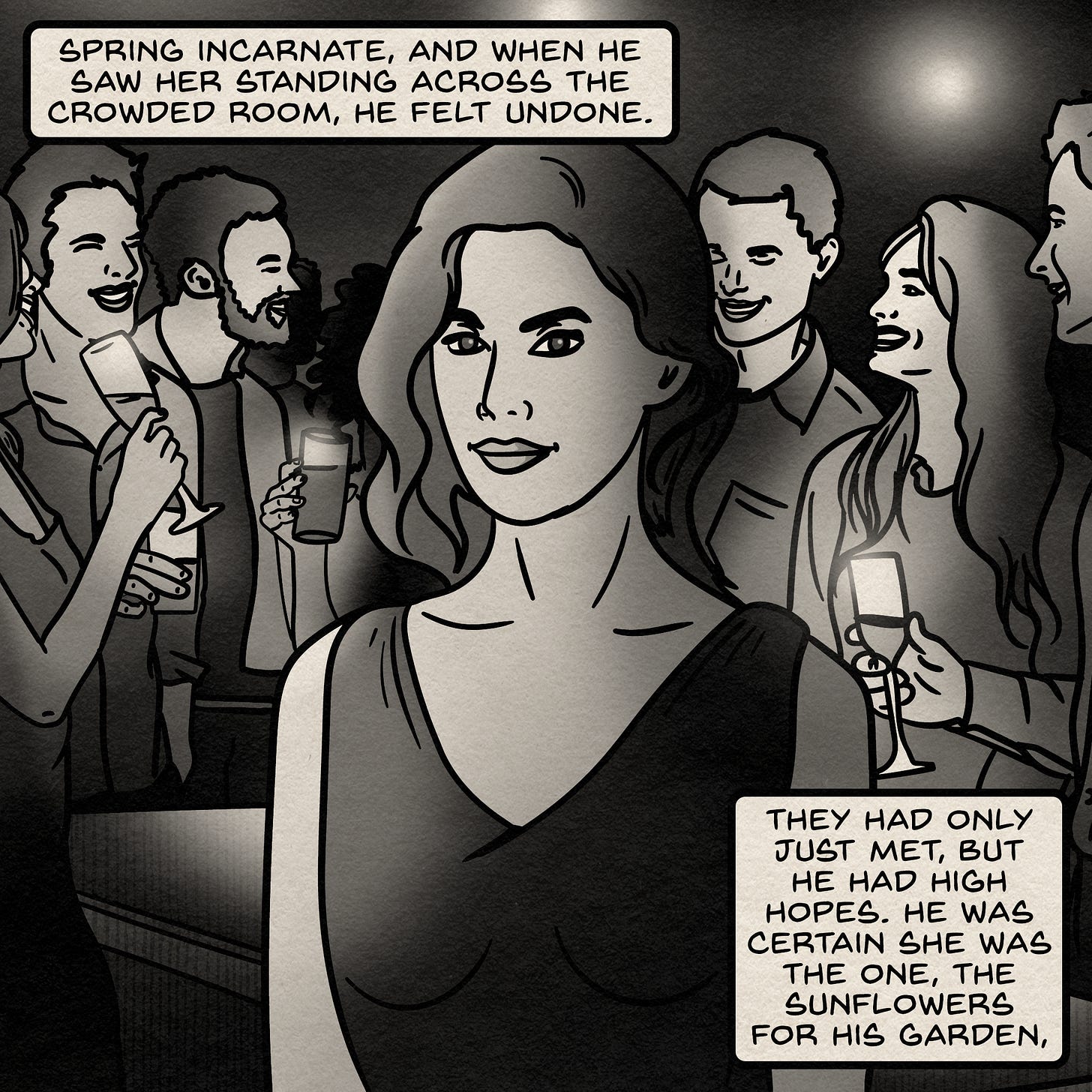 The song came on during an autumn drive, and the scene arrived fully formed: golden light, a crowded room, a man gathering courage to cross toward someone who felt like home before he even knew her name.